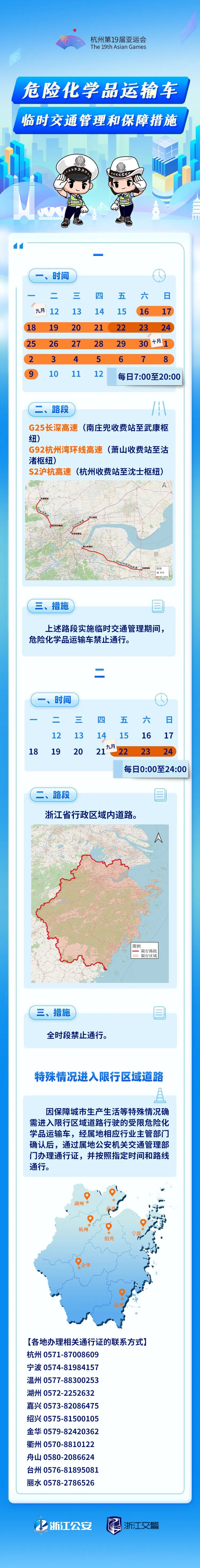 为缓解中秋、国庆假期带来的大流量压力,确保安全、顺畅、有序的道路交通环境,亚运会期间浙江公安交通管理部门将在G25长深高速南庄兜收费站至武康枢纽、G92杭州湾环线高速萧山收费站至沽渚枢纽、S2沪杭高速杭州收费站至沈士枢纽路段对危险化学品运输车分时分段实施交通管理措施。
