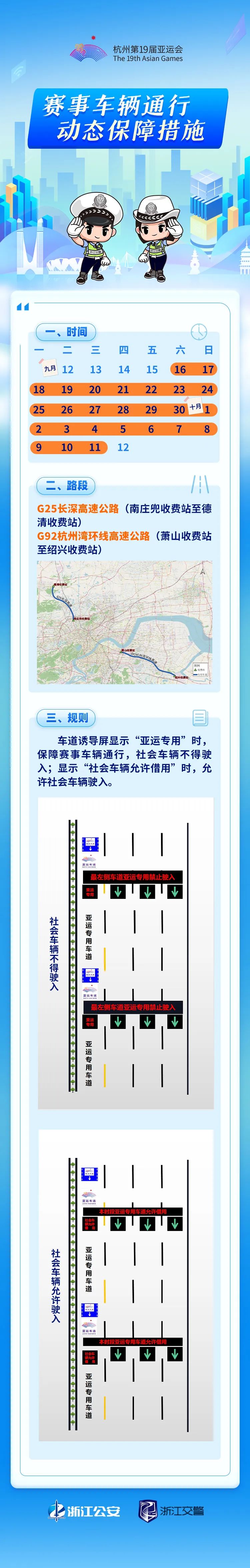 为缓解中秋、国庆假期带来的大流量压力,最大限度减少对群众工作生活出行影响,亚运会期间浙江公安交通管理部门将对G25长深高速公路南庄兜收费站至德清收费站、G92杭州湾环线高速公路萧山收费站至绍兴收费站的亚运专用车道采取动态交通管理措施。车道诱导屏显示“亚运专用”时,保障赛事车辆通行,社会车辆不得驶入;显示“社会车辆允许借用”时,允许社会车辆驶入。