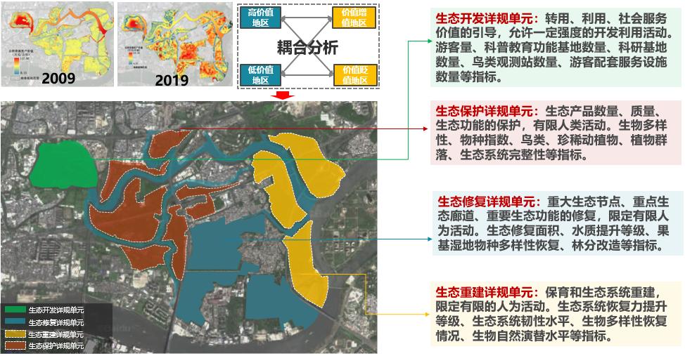 选取全国4个典型案例开展自然资源分区划定建立分区到单元的传导体系,国内首创空间可视化的自然资源资产价值评估法,识别价值高低和价值增值贬值区域,通过耦合分析模型将分区划分为四种生态详规单元,提出差异化的生态详规编制指引,实现自然资源管控从总规到详规的传导。