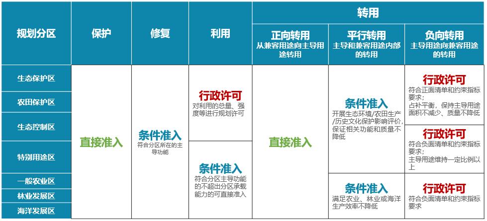通过耦合分析模型划分生态详规单元,提出差异化的编制指引落实要素市场化配置要求,优化空间管制规则,制定分区主导用途和兼容用途清单,底线区实施正面清单管理,其他区实施负面清单管理。针对自然资源保护、修复、利用、转用四类活动,采取“准入、许可”相结合的空间管制方式,通过分区与地类的叠加管理,引导资源向适宜空间集聚,优化自然资源空间配置。