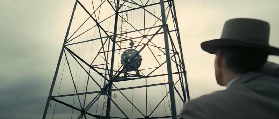图片截取自《奥本海默》宣传片核爆火球的表面超过 2 万摄氏度,其光强度超过太阳表面的 100 倍,这些光会急速将附近的固体全部气化。地面核试验时原子弹有时并非真的摆在地面上,而是会放在一座小塔上(正如电影中段展示的那样),为了保持塔的稳定,会用倾斜的缆索从塔顶拉到地面作为支撑。这些角就是气化中的缆索。