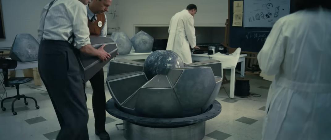 所谓的炸药透镜就是电影中段出现好几次的那个需要一块块拼起来的奇怪多面体。叫炸药是因为它是炸药做的,叫透镜是因为这些炸药的目标是把爆炸的能量全都聚焦到恰当的位置上,以引爆原子弹,就像透镜能把阳光聚焦到一点上一样。