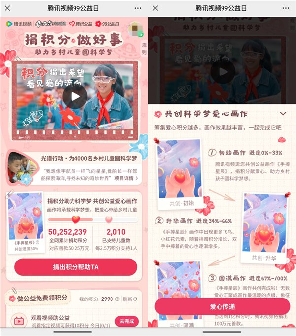 与此同时,腾讯视频还开启了共创科学梦爱心画作《手捧星辰》的活动,随着用户捐赠积分的累积,画作中的爱心元素将不断增加,在画作共创完成之后,腾讯视频也将为4000多位乡村孩子的科学梦捐出相应的善款,进一步传递人人公益的深远价值。
