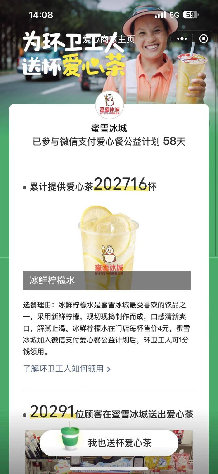 “微信支付爱心餐”是微信支付联合中华社会救助基金会、腾讯公益、各类爱心企业,以及社会公益组织等共同发起的公益项目,能够让城市环卫工人以1分钱的价格,在合作的爱心企业门店内享受爱心餐和爱心水。蜜雪冰城作为新式茶饮品牌代表,率先支持爱心茶服务,为环卫工人消暑解渴带来清凉。