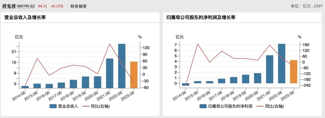 连续8年的高速增长之后,酒鬼酒在2023年上半年遭遇最大“挫折”,尽管有如此多前缀头衔的加持,但其半年报业绩难让投资者高兴起来。2023年半年报显示,今年1~6月期间,酒鬼酒实现营业收入15.41亿元,同比下降39.24%;实现净利润为4.22亿元,同比下降41.23%;经营活动产生的现金流量净额为0.83亿元,同比下降72.35%。
