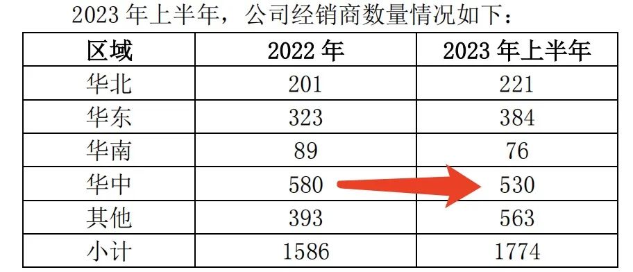 半年报显示,2023年上半年,酒鬼酒线上渠道销售1.12亿元,线下渠道销售14.25亿元。其中,酒鬼酒对前五大经销商客户销售收入为5.85亿元,占半年度销售总额比例为38.07%。截至2023年上半年,酒鬼酒经销商数量为1774家,较2022年末增加188家;期末,酒鬼酒成品酒库存5708吨,基酒库存39448吨。