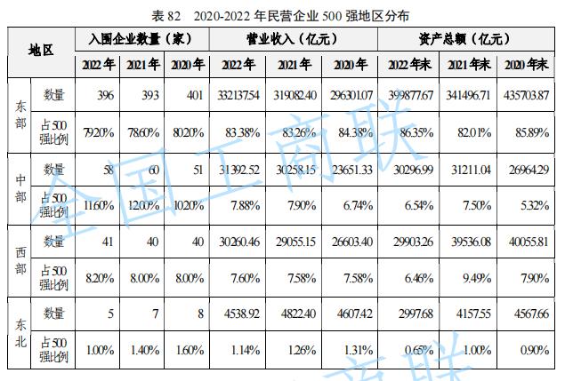 东部地区历来民营经济发达。报告显示,2022年,东部地区共有396家企业入围民企500强,占总量的79.2%。尽管数量比上年增加了3家,仍未回到2020年水平,还有“5家”缺口。