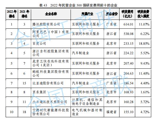 报告显示,2022年,研发费用排名前十位的500强企业涉及互联网和相关服务,汽车制造业,计算机、通信和其他电子设备制造业,电气机械和器材制造业等4个行业。