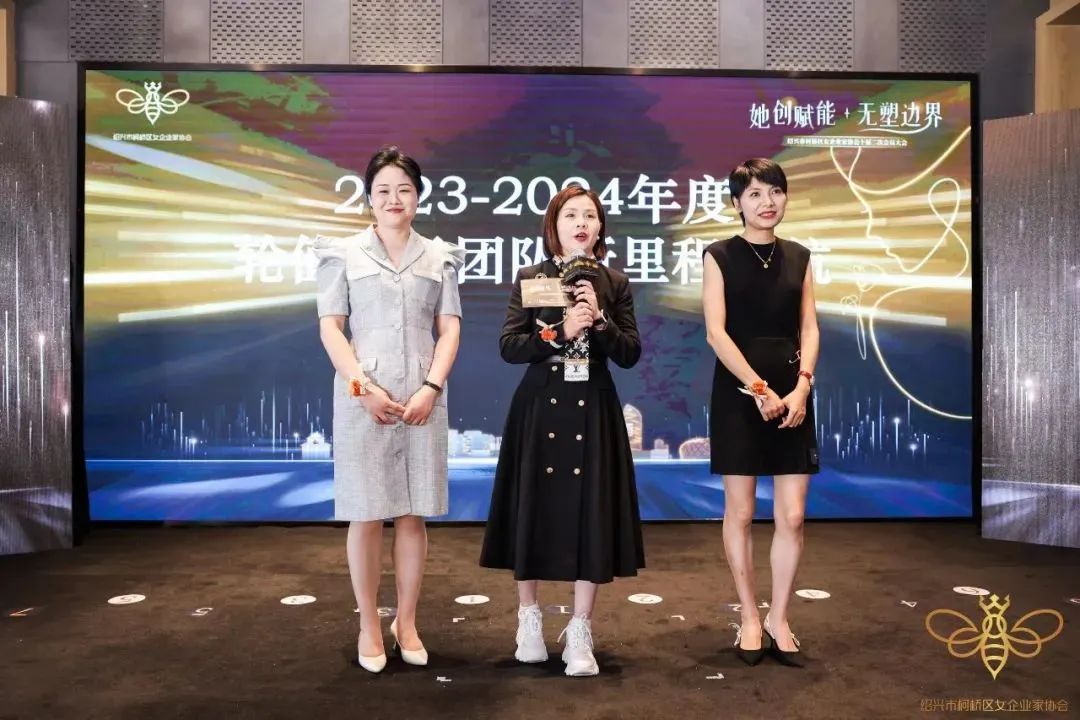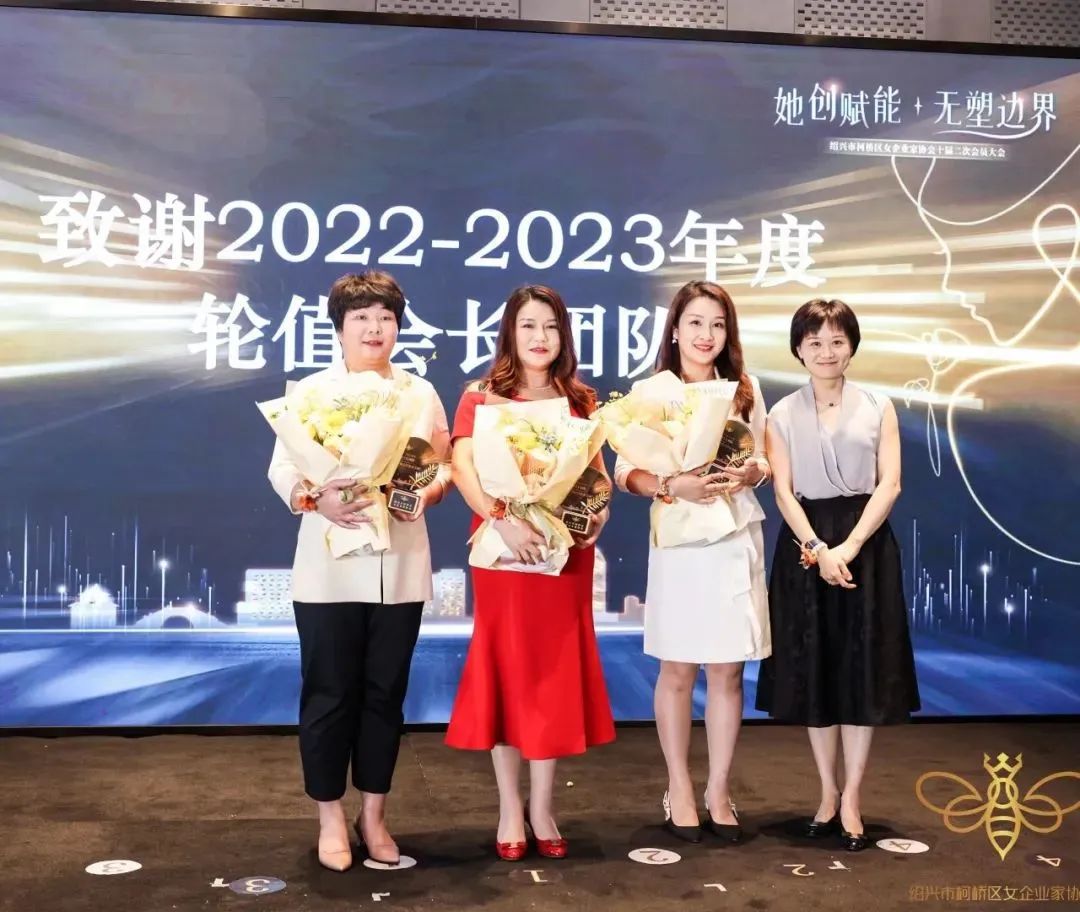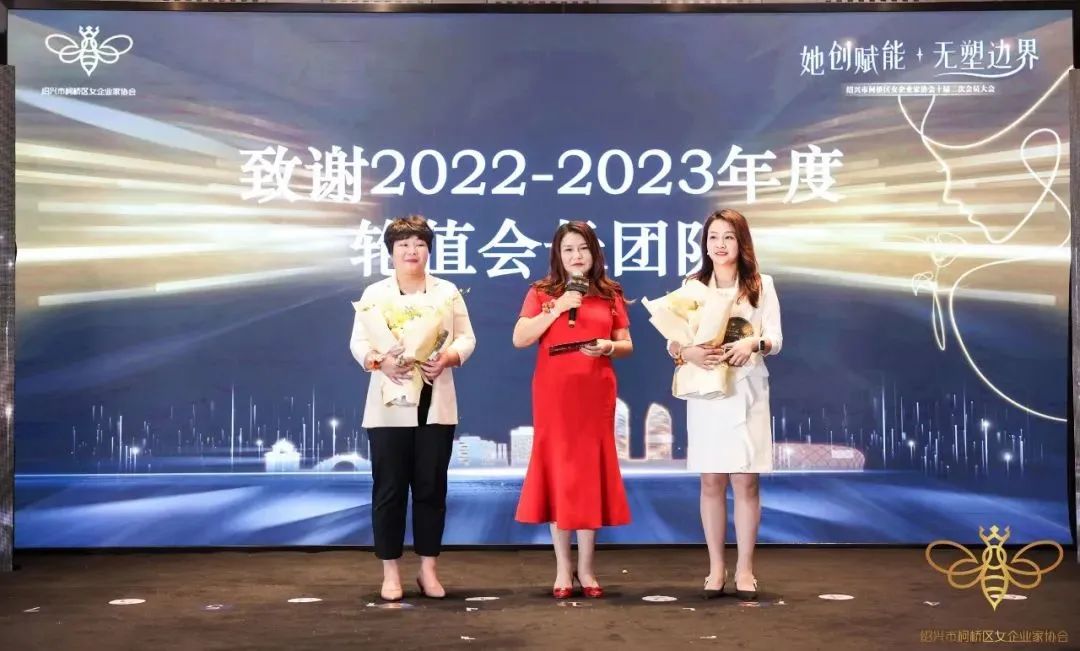 柯桥区妇联党组书记、主席于琪为2022-2023年度轮值会长团队颁发奖杯
