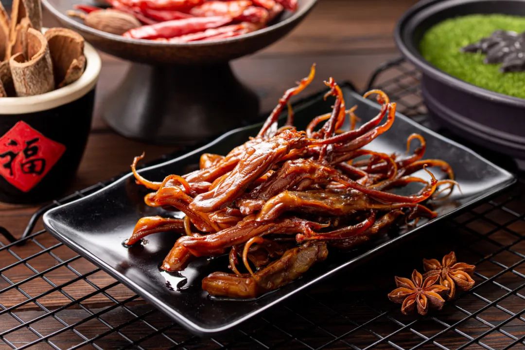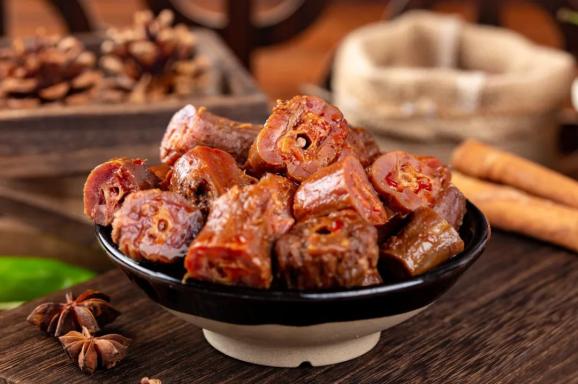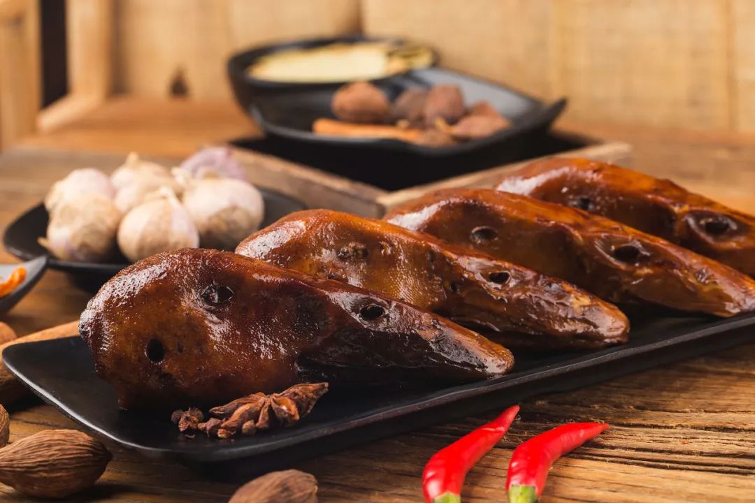3.很多卤鸭颈店都声称用了几十种香料,其实香料的种类不在于多、量不在于大,只需八九种即可,关键在于要掌握好用量比例,使香料达到和味的效果,呈现出一种若有若无的香味。