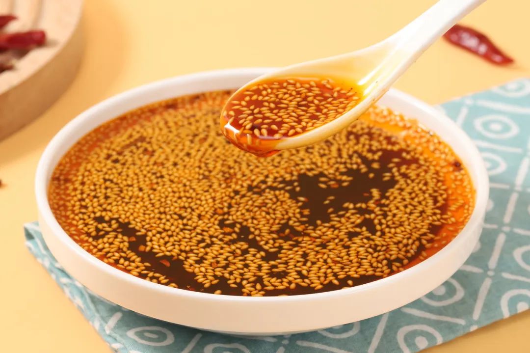 在装有汤的不锈钢桶内放入香料包、大红袍干花椒1千克、干贵州七星椒2.5千克,大火烧开,改小火烧约3小时,此时辣椒和花椒的味道已经全部融入汤中,放入糖色约1千克、白胡椒碎(装入纱布袋中)50克、适量的盐和味精500克烧开,过滤料渣。