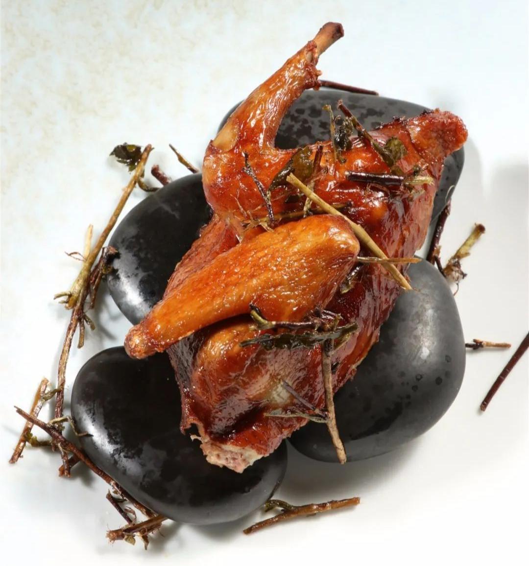 4.碗中垫入烤烫的鹅卵石,撒少许烤香的老茶杆,摆入半只乳鸽,再撒入少许茶杆即可走菜。