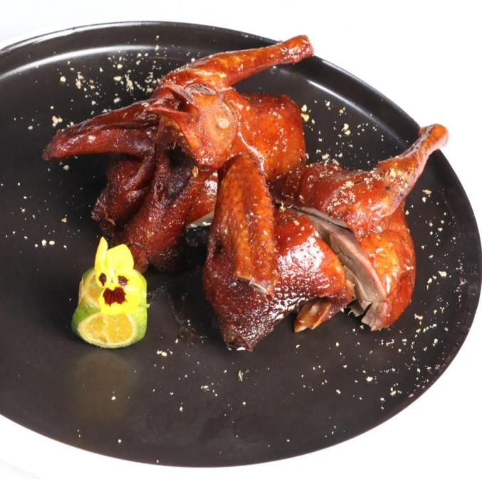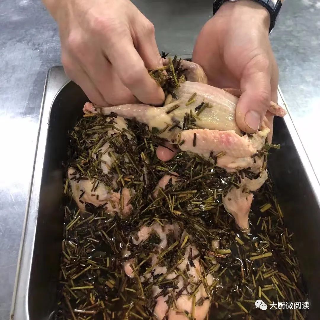 乳鸽以“冷卤浸泡”的方式充分入味,咸鲜滋润、香透骨髓;腹部塞满产自雅安的老茶杆,挂皮水、涂蛋清后送入烤箱,成菜有股浓郁茶香,且外皮酥脆,久放不塌。制作流程: