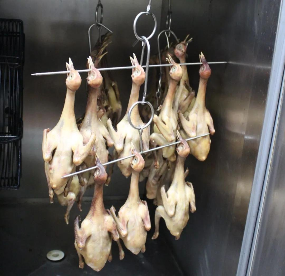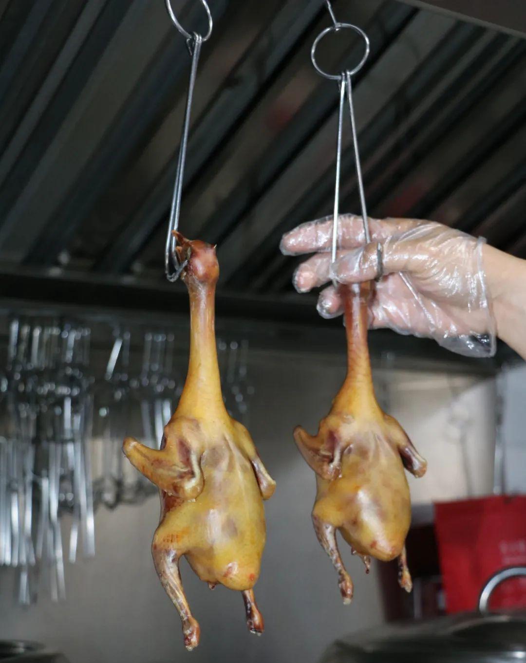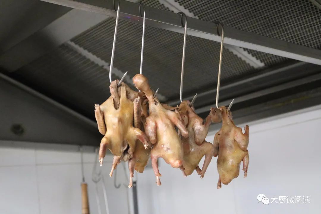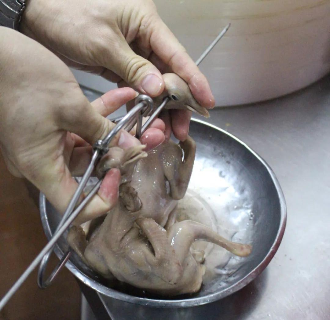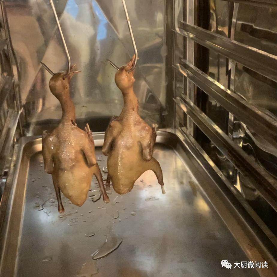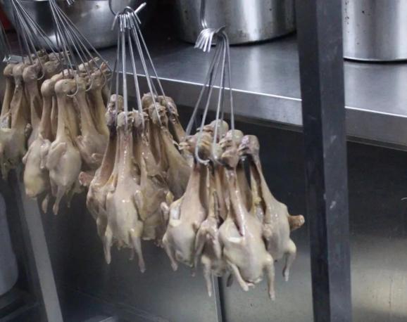 2.乳鸽上皮水后通常要风干,而“新斗记”的大厨们认为这样费时较长,会影响原料的新鲜度,因此他们把上完皮水的乳鸽挂在烧鸭炉内烘干,缩短了操作时长。