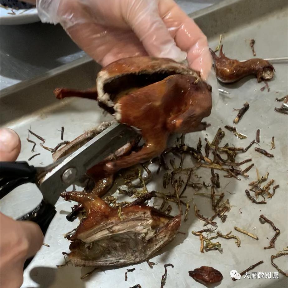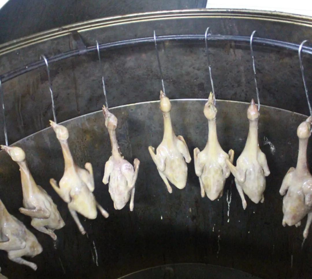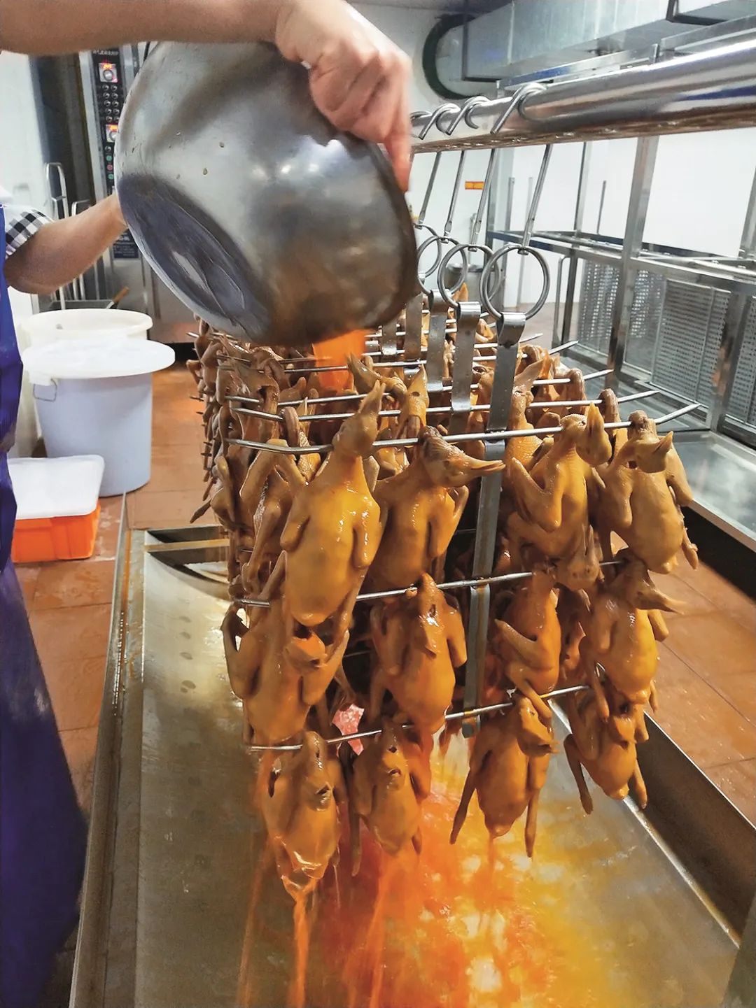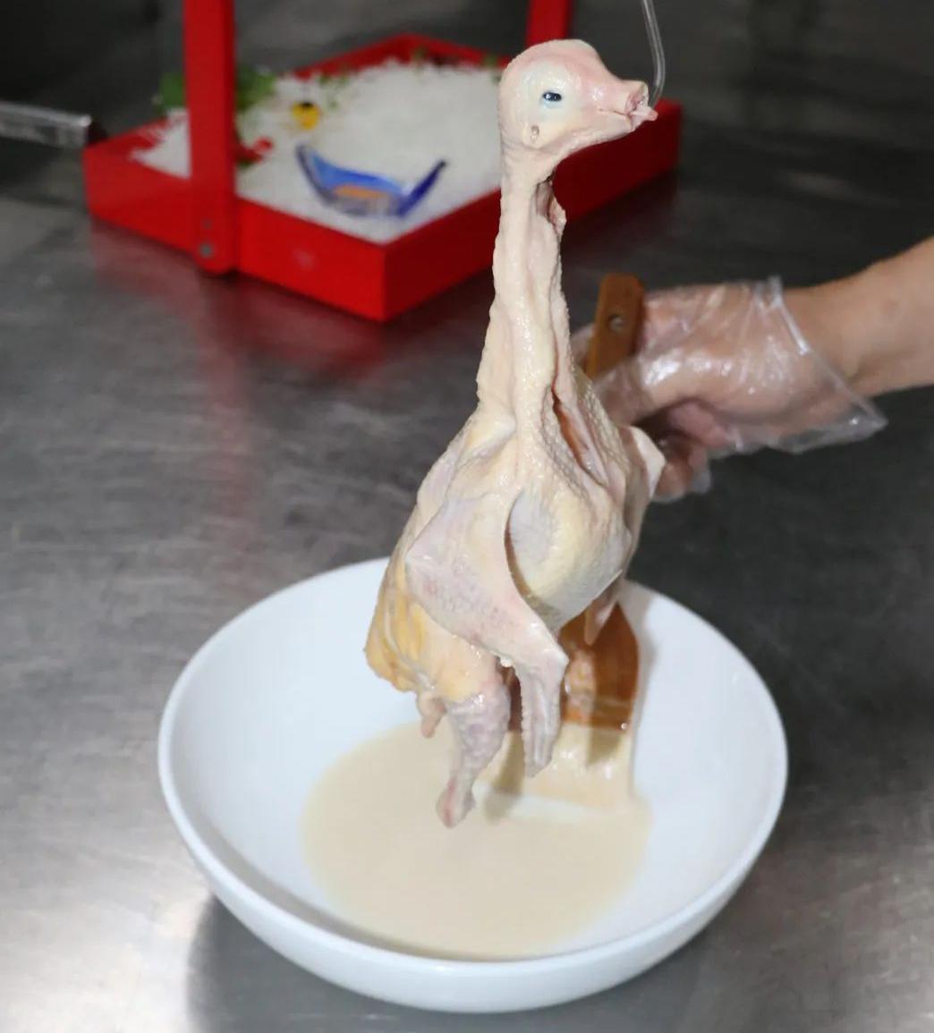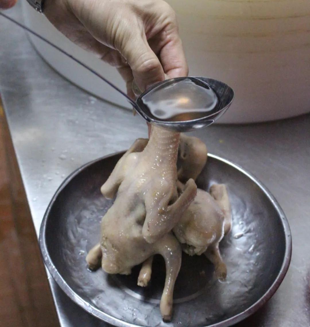 2.乳鸽上皮水后通常要风干,而“新斗记”的大厨们认为这样费时较长,会影响原料的新鲜度,因此他们把上完皮水的乳鸽挂在烧鸭炉内烘干,缩短了操作时长。