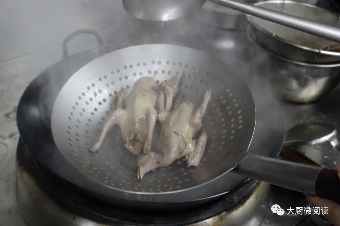 2.腌好的乳鸽入沸水烫皮。