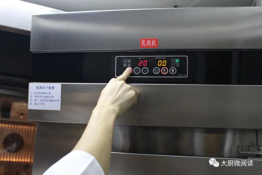 此菜所用的风干机是订制的,借鉴吹风机的原理,可分别设置冷风或热风,其中热风温度约为50℃,冷风约20℃。这台风干机可保证乳鸽的风干效果,避免遇上连阴天时乳鸽迟迟无法风干的情况。气候干爽的地区,可将乳鸽直接挂在通风处风干。