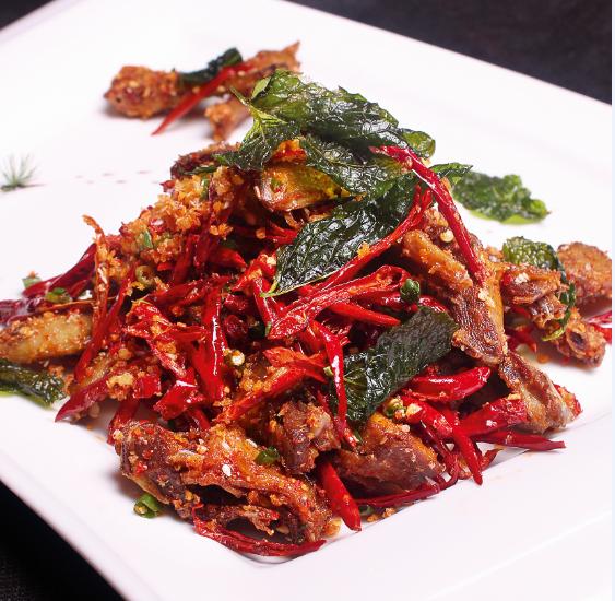 2.锅入香茅薄荷油20克烧至五成热,放入姜末、蒜末各10克、干辣椒段40克小火炒香,放入乳鸽块,加自制面包糠40克、鸡粉、味精、白糖各2克、辣椒面8克、花椒面6克、孜然粉10克翻匀,起锅淋香茅薄荷油、花椒油各5克装盘,撒炸酥的薄荷叶装饰即可。