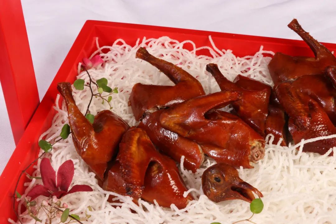 乳鸽100只(每只重约200克)宰杀治净,去掉头、颈、尾及内脏,飞水后捞出冲净,下入潮式卤水中微火卤10分钟,关火浸泡20分钟入味,捞出晾凉备用。