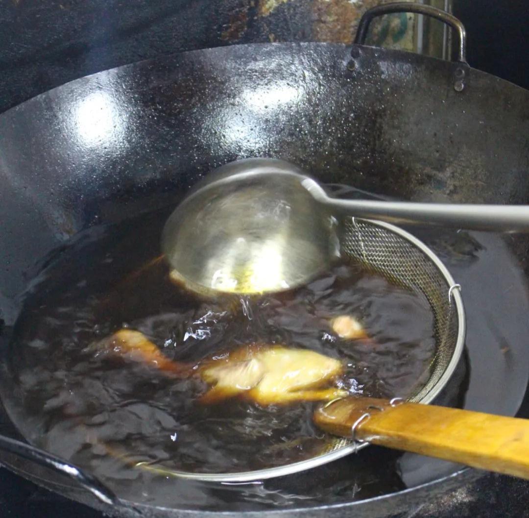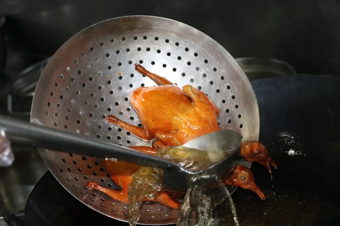 7.走菜时将已风干的鸽子投入炸锅内浸炸3-4分钟至上色即可。