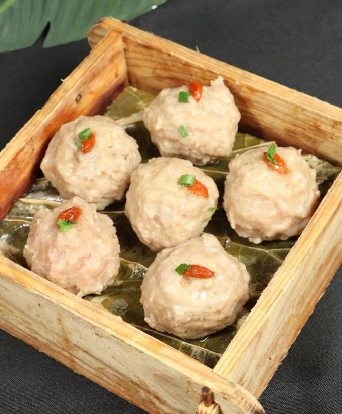 2.取做好的丸子6个放入垫有干荷叶(修剪成笼屉大小,提前入清水泡透)的竹屉,在每个丸子上点缀枸杞1个,放入蒸箱蒸10分钟,取出点缀香葱花即可上桌。