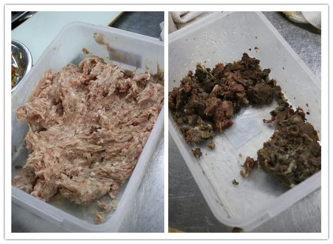 1.提前预制好的猪肉馅和鸽子馅。