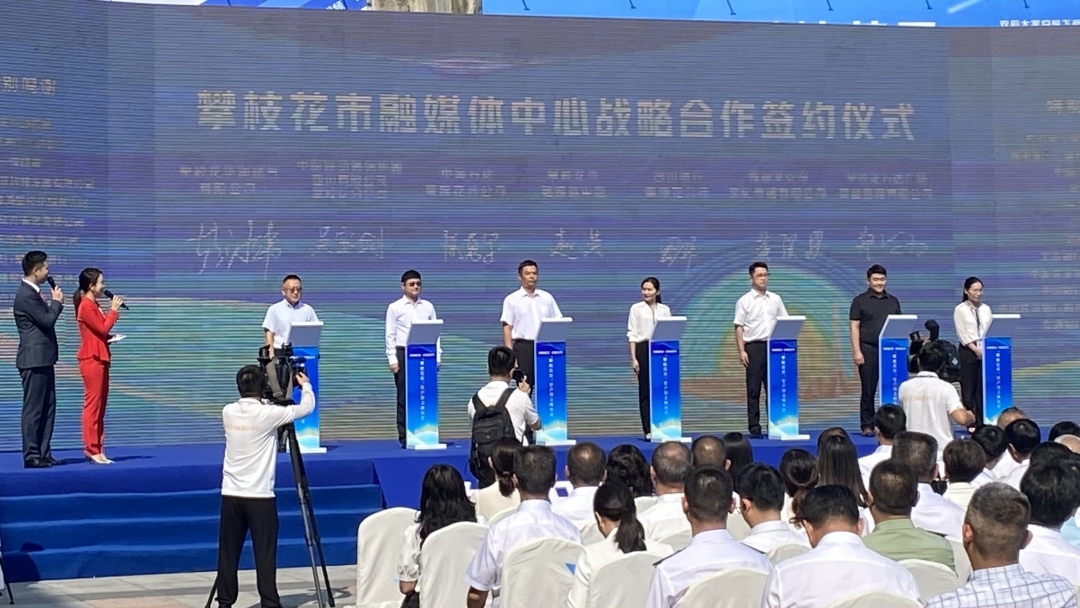 市融媒体中心与6家战略合作企业代表现场签约。记者 吴晓龙/摄影新华社、四川日报社、四川广播电视台、封面新闻、四川经济日报社、自贡日报、泸州市广播电视台、绵阳市广播电视台、遂宁传媒集团、乐山日报社、达州日报社、雅安市融媒体中心、巴中市广播电视台、凉山日报社、凉山州广播电视台、丽江日报社、大理日报社、绍兴市新闻传媒中心、湖州市新闻传媒中心、张家港市融媒体中心等全国媒体同仁向“攀枝花开”客户端正式上线发来祝贺视频。