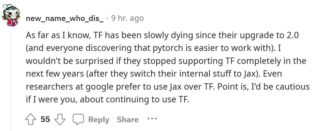 这位作者的经历得到了众多网友的附和,有人表示 TensorFlow 已经「死了」,就连谷歌工程师都要用 JAX 替代 TensorFlow。