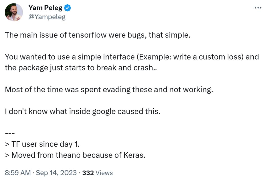 著名软件开发者、Deep trading 创始人 Yam Peleg 表示,TensorFlow 的主要问题在于 bug。当你想使用一个简单的界面(如编写自定义损失)时,包不一会就损坏和崩溃了。因此不得不将大多数时间花在如何回避这些 bug 而不是工作上。