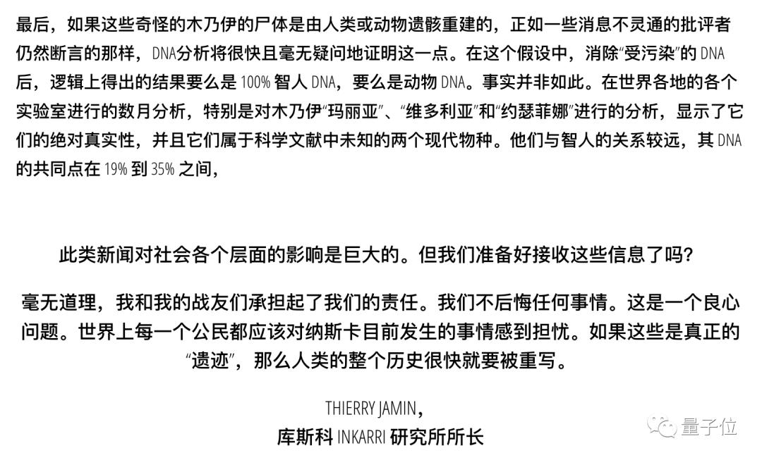 会上披露:从遗骸中提取的DNA显示其不是人类,DNA测序发现仅有70%遗传物质和人类相似。