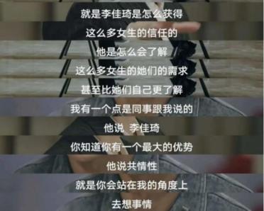 李佳琦很清楚自己的优势在哪儿,在一次面对主持人杨澜的访谈中,他说,自己最大的优势是共情力和换位思考的能力。