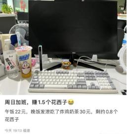 周末加班一整天,赚1.5个花西子,扣去午饭和晚饭,净收入只剩0.8个花西子。