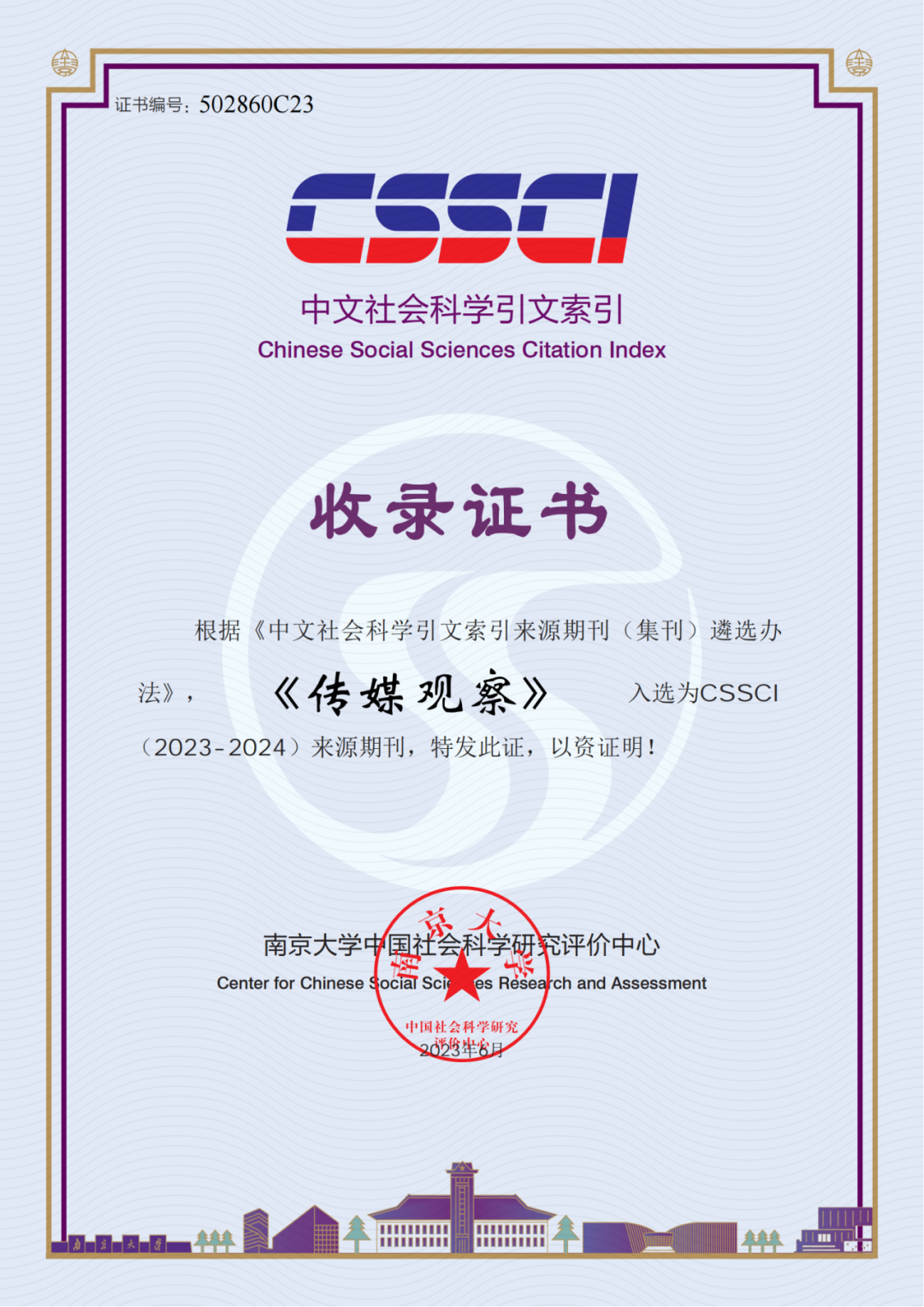 9月15日,《传媒观察》在其微信公众号上宣布,近日,该刊收到南京大学中国社会科学研究评价中心的CSSCI(2023-2024)来源期刊收录证书,《传媒观察》入选CSSCI来源期刊。