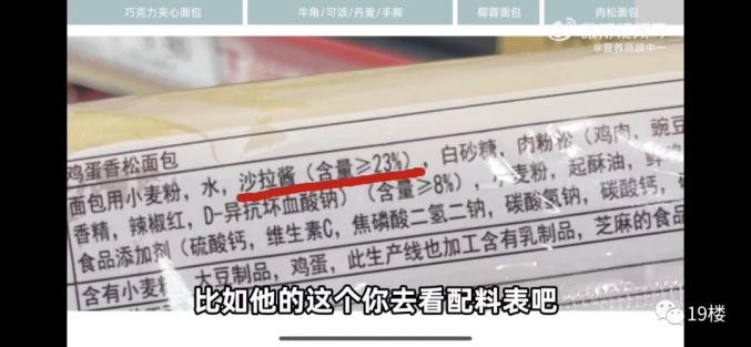 比如某品牌一款肉松面包就标明了沙拉酱含量≥23%,沙拉酱用量是远超肉松粉的。