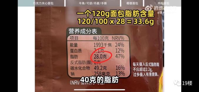 第一类,巧克力夹心面包。关键在于其脂肪含量。顾中一对比了综合超市货架上所有的40款面包,其中3款巧克力夹心面包脂肪含量最为夸张,高达30%,一个120g的面包热量在600kcal以上。