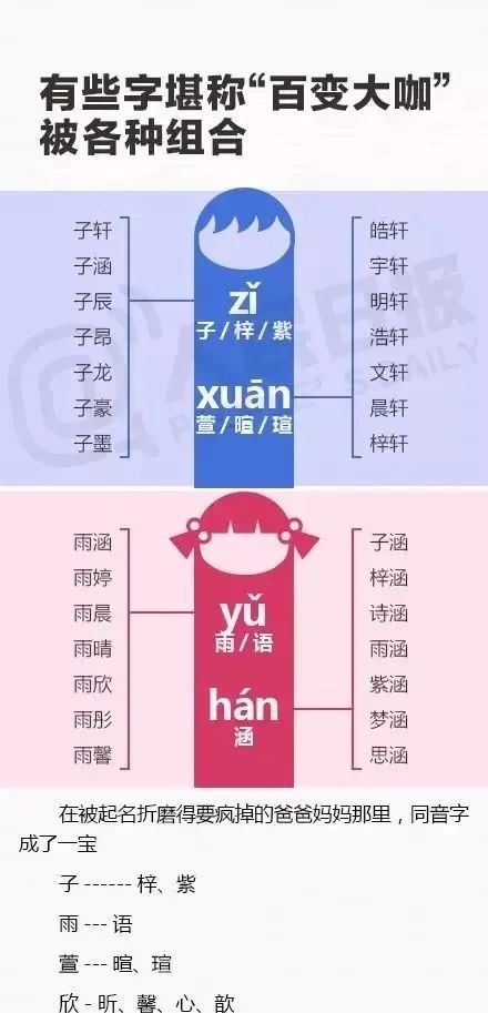 剧中角色名,就成为了子轩子涵们的前身。只要将“梓”、“宇”、“子”等字随意组合,就能拥有偶像剧中男女主角类似的名字。