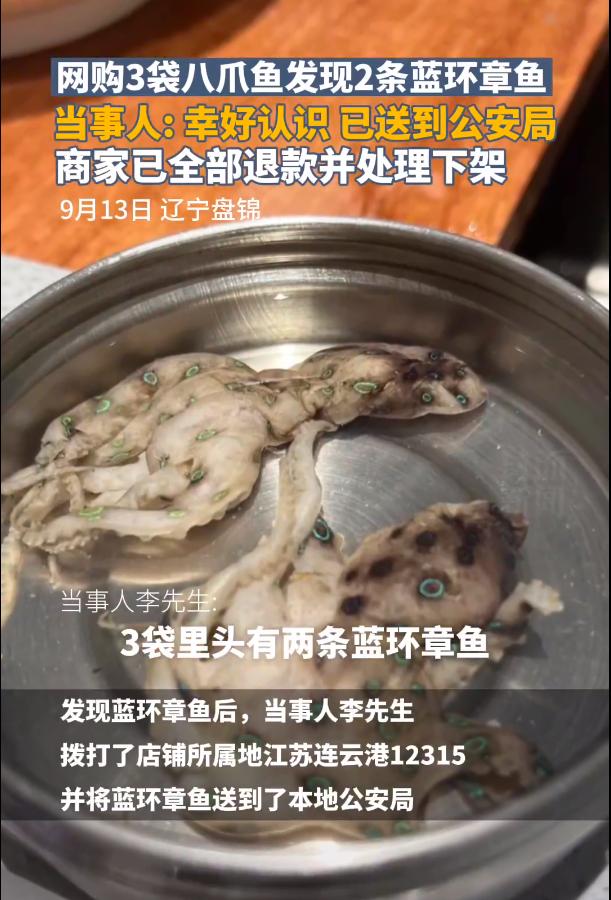 李先生称,自己四五天前在一家网店购买了三袋小章鱼,花了85.95元,前天收到了货。昨晚,他准备煮一袋,打开后却在里面发现了蓝环章鱼。“我水都烧好了,就等着下了,一看不对。”李先生表示,很久之前他看过一本漫画里有关于蓝环章鱼的介绍,他一眼就认出来了。