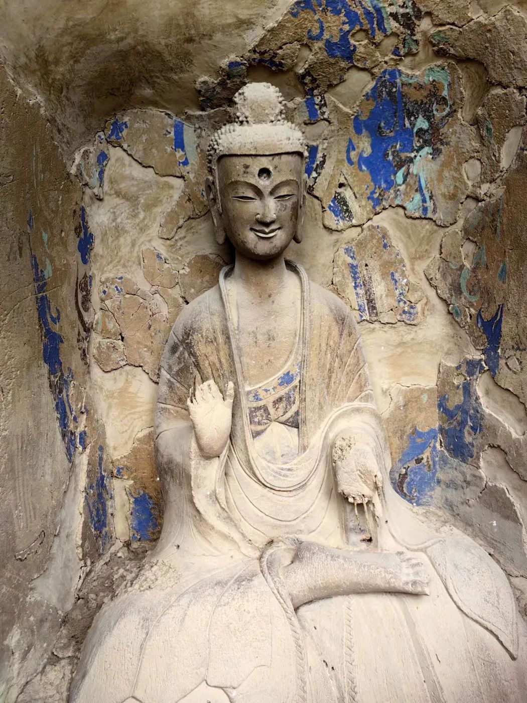 麦积山石窟佛造像,既不似皇家石窟那般凛然、不可亲近,也不似世俗化的石窟那般甜俗,扑面而来的是一种神秘温婉的气息,而不是拒人于千里之外的宗教威严。