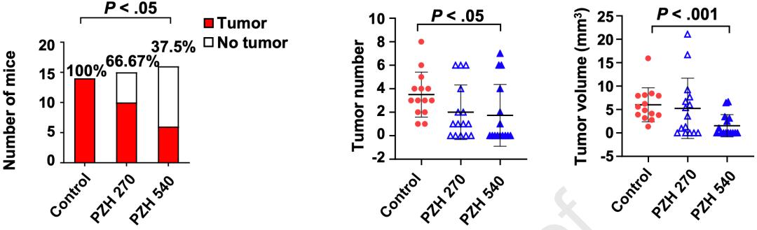 从实验结果来看,与对照组(100%)相比,片仔癀处理组小鼠的肠癌发生率显著降低(低剂量组66.67%,高剂量组37.5%)。此外,在两种肠癌小鼠模型中,高剂量片仔癀处理组的肿瘤数量和体积都显著更小。