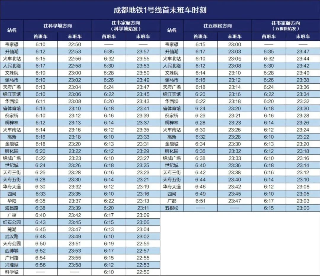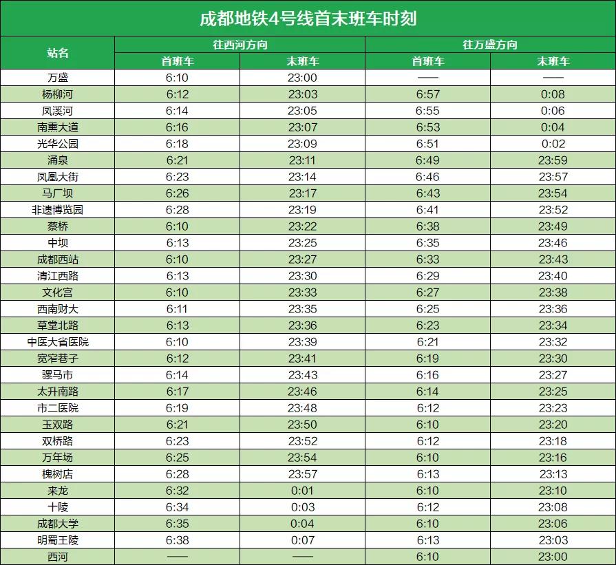4号线首末班车时刻表18号线