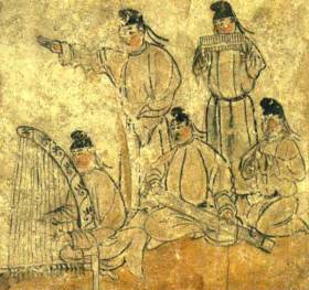 卧箜篌的身份尚有些疑团,有学者通过对比今日新疆地区的“卡龙”这一乐器,认为卧箜篌是从西域传入体量较小,平放在腿上弹奏的箜篌。