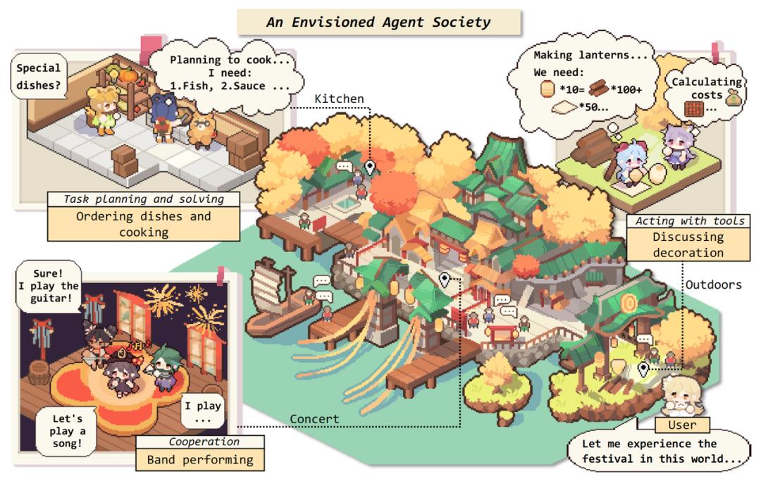 作者们设想的一个由智能代理构成的和谐社会,人类也可以参与其中。场景取材自《原神》中的海灯节。一个 Agent 的诞生