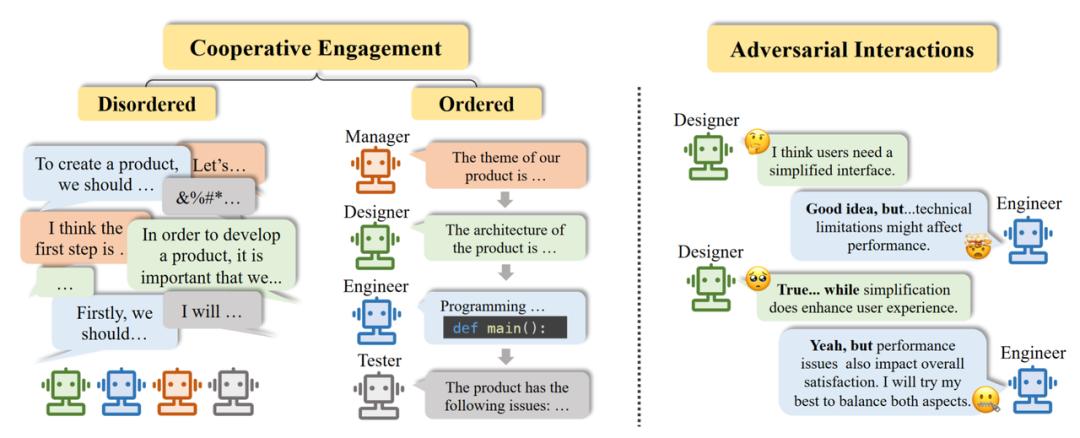 对抗型互动:智能代理以一种针锋相对(tit for tat)的方式进行互动。通过竞争、谈判、辩论的形式,代理抛弃原先可能错误的信念,对自己的行为或者推理过程进行有意义的反思,最终带来整个系统响应质量的提升。