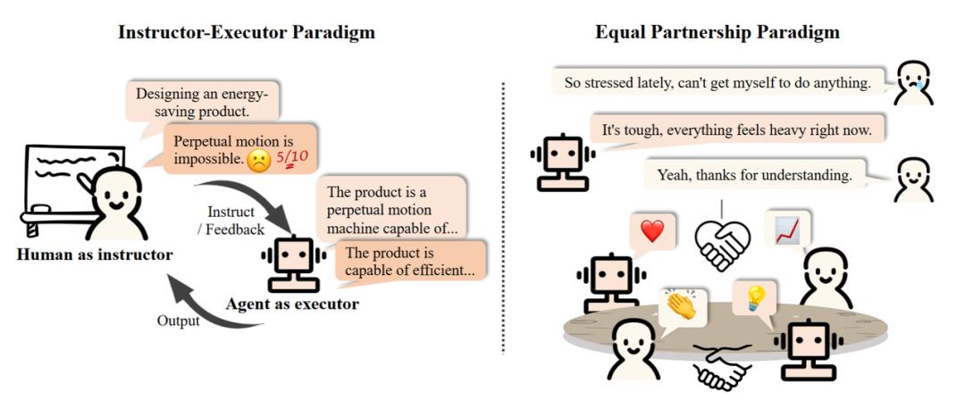 人机交互场景的的两种模式:Instructor-Executor 模式 vs. Equal Partnership 模式。Instructor-Executor 模式:人类作为指导者,给出指令、反馈意见;而代理作为执行者,依据指示逐步调整、优化。这种模式在教育、医疗、商业等领域得到了广泛的应用。