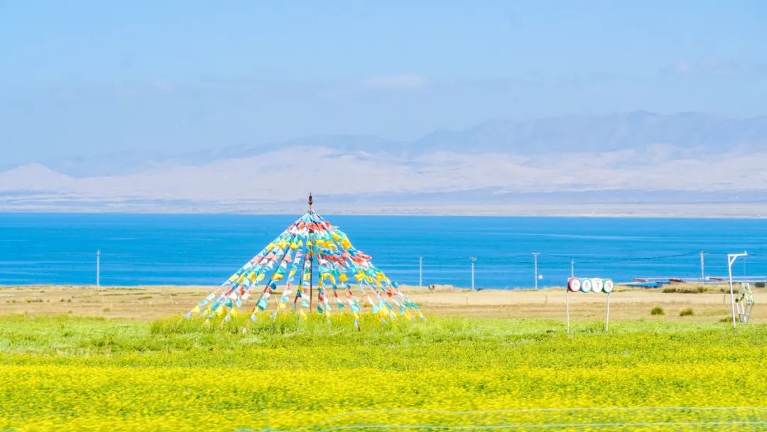 7月的青海湖美到极致,这里的油菜花大片盛开,一片片金灿灿的黄色倒映在碧水蓝天之间,远处看着美如画卷。地址:青海省海南藏族自治州