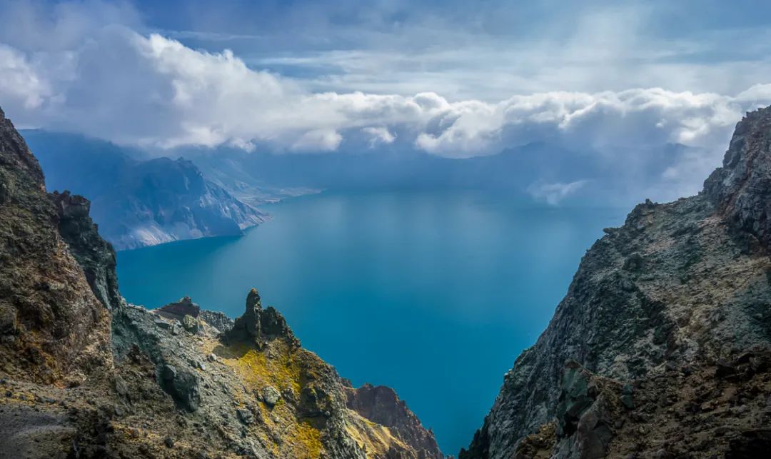 长白山天池是一座休眠火山,火山口积水成湖,夏融池水比天还要蓝;冬冻冰面雪一样的白,被16座山峰环绕,仅在天豁峰和龙门峰间有一狭道池水溢出,飞泻成长白瀑布,是松花江的正源。