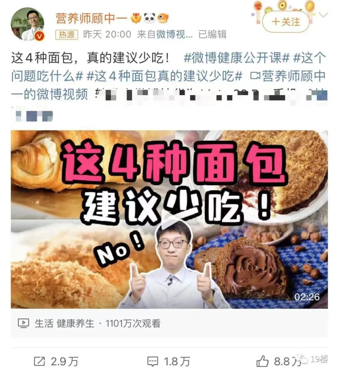 近日,微博大V、清华大学公共卫生硕士、北京营养师协会理事顾中一发布了一则视频,提醒大家,有4种面包建议少吃,分别是巧克力夹心面包、牛角/可颂/手撕/起酥类面包、椰蓉面包、肉松面包。为什么要少吃?顾中一在视频中一一做了解释。