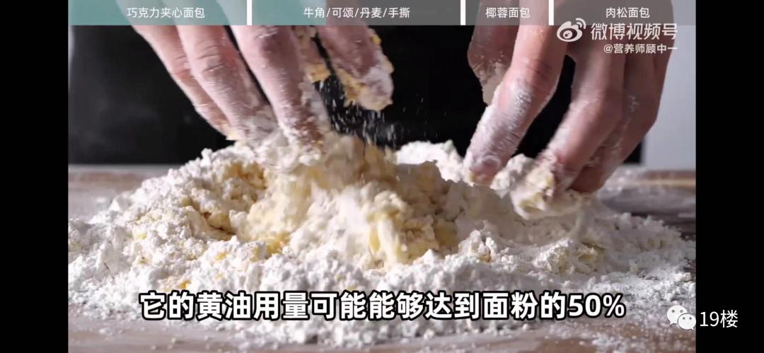 辨认特点是这种面包表面不光滑不饱满,而是能看到层层叠叠泛着光泽的褶皱,面包坊里看到这种面包,没附上营养成分表你也该知道是热量炸弹。超市里的这类面包,品名一般叫牛角包、手撕面包、起酥面包、酥皮面包之类的,不过一般舍不得用黄油,而是植物油代替。为了让价格低廉的植物油也起到类似黄油的效果,大多需要经过氢化等工艺的处理,虽然现在厂家都很注意降低反式脂肪酸产生了,但成品也会包含大量饱和脂肪,过量摄入饱和脂肪有害健康。
