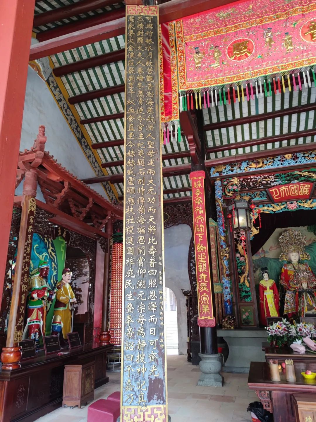 下联:万家香火,金像庄严,庙享千秋血食,直至今赫赫威灵显应,扶社稷护国祚庇民生,迭奉帝诏曰,予嘉乃丕绩,封尔太冼夫人,春禴冬蒸,常使令官主祀,笺题石刻,时传岭海讴思,闲尝仰溯元宗,每为静搜神记,真可与竹林水月,救苦观音,渤海慈航,济人圣母,运两大元功而天将比寿,普四照恩泽而日可齐光。