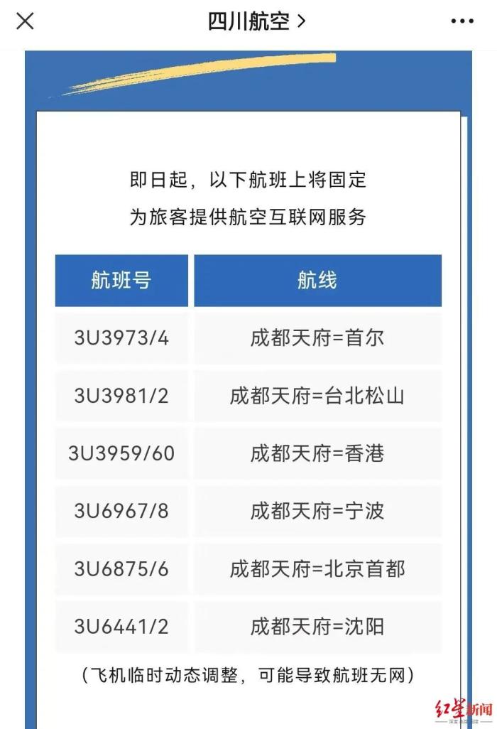此外,川航在其公众号上提醒,如果飞机临时动态调整,可能会导致航班无网的情况。